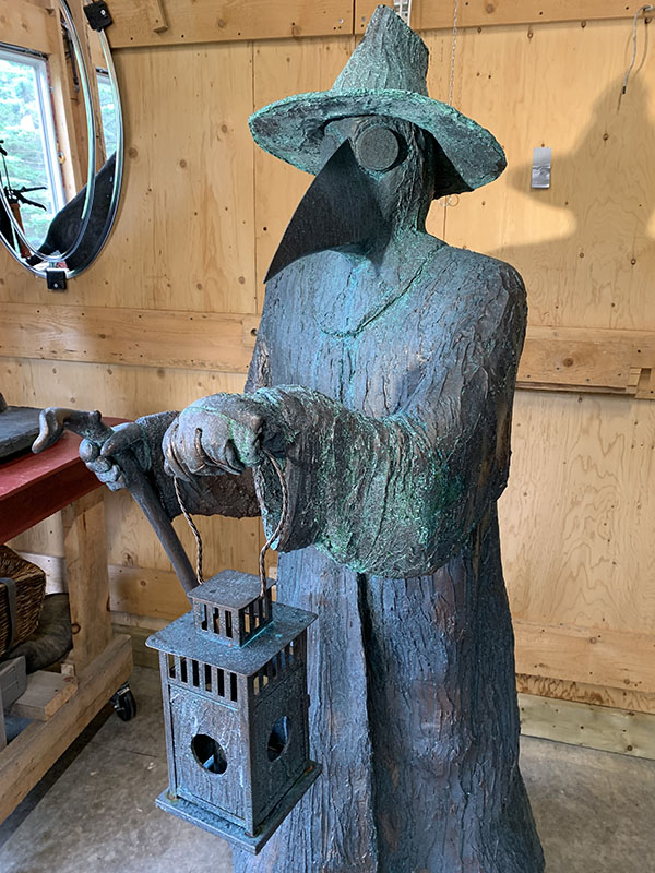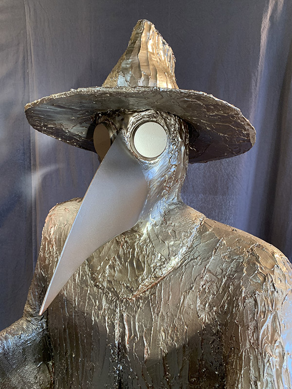 Without a doubt, the predominant societal condition of today relates to the COVID-19 pandemic. Plague Doctor is exceedingly poignant to medicine at this time of the SARS-CoV-2 Pandemic. It dramatically harkens back to the great Black Death Plagues of Medieval and Renaissance Europe. The piece is modeled after the plague doctor garb developed by Dr. Charles de Lorme, physician to Kings Louis XIII & XIV of France, and Catherine de Medici among others. The garb is very much like the PPE worn by health care professionals during the current pandemic.
