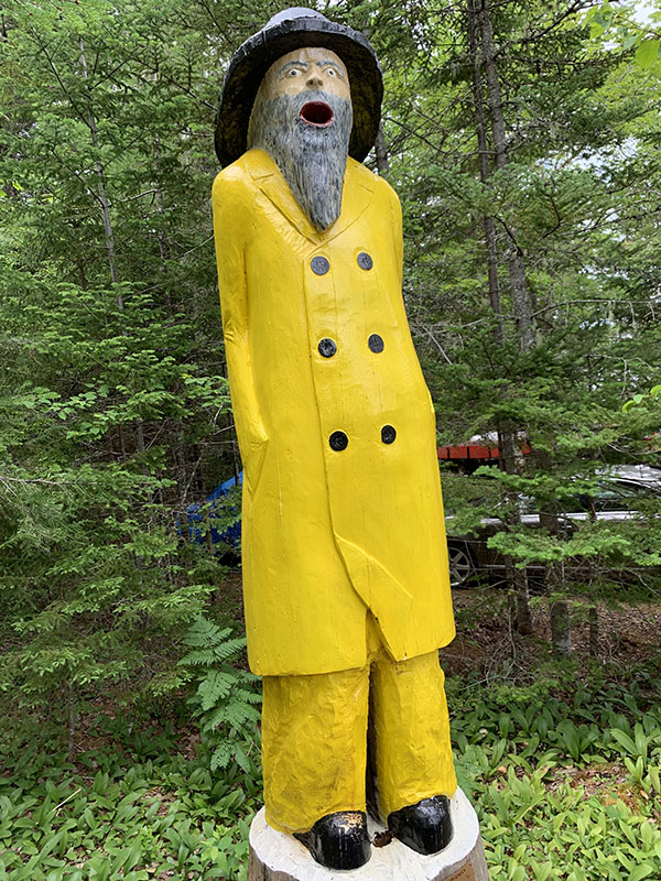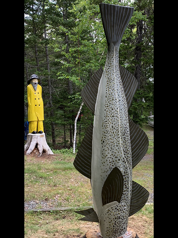 My father-in-law wanted me to sculpt two large spruce trees at his cottage at Aylesford Lake, Kings County, NS. Since he descends from a fishing heritage in Lunenburg County, I suggested the idea of an old fisherman looking shocked and astonished at seeing a gigantic codfish heading underground at a lake sequestered deep in the forest.